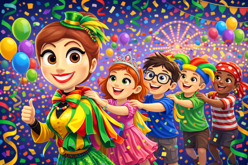 Kinderen leren carnavalswoorden als confetti, podium en kostuum gebruiken in zinnen en korte verhaaltjes.